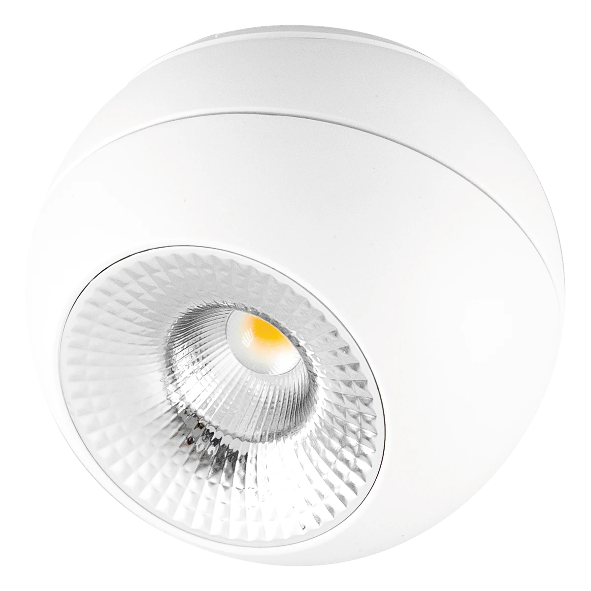 Deckenanbauleuchte für vielfältige Anwendungen im Innenbereich. Sowohl Effektbeleuchtungen, Raumbeleuchtung, Akzentuierte Beleuchtung und vieles mehr, lassen sich mit dieser Leuchte umsetzten. Die Leuchte lässt sich um 340° drehen, wobei durch die schräg zur Montagefläche ausgerichteten Achse, bei einer Drehung um 180° automatisch ein Schwenkwinkel von 40° entsteht. Der Blendwert beträgt UGR kleiner 22. Die Farbe entspricht ähnlich RAL9016.