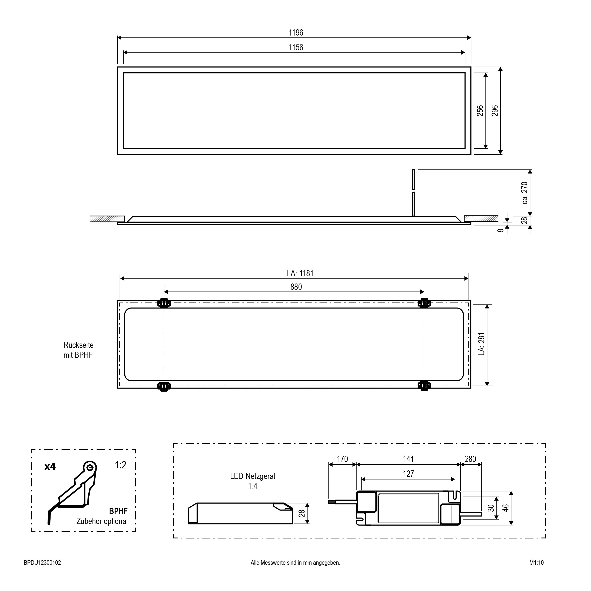 | Abmessung (LxBxH) | 1196 x 296 x 28 mm |