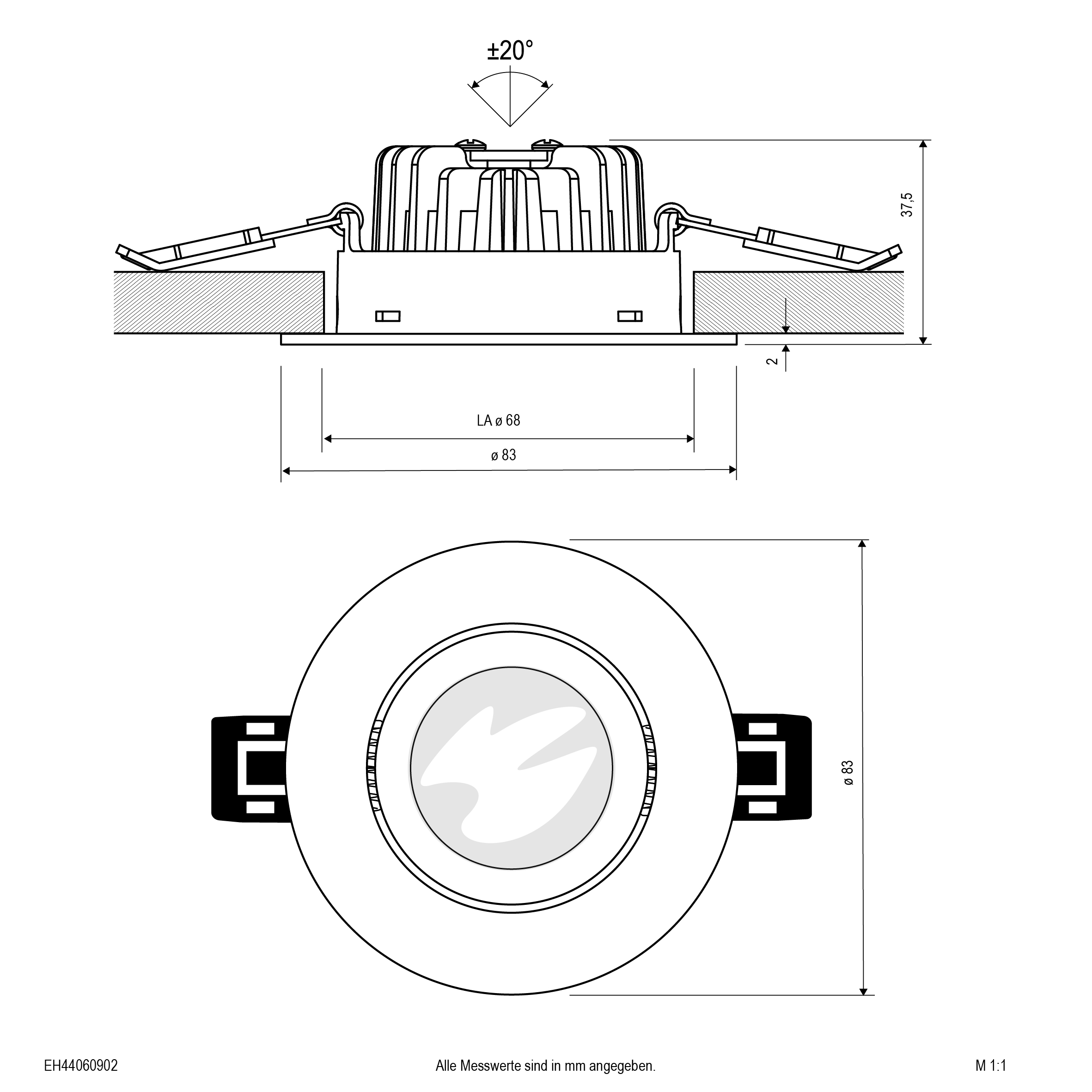 Mit der DOB-LED Deckeneinbauleuchte lassen sich vielfältige Anwendungen im Innenbereich, wie z. B. Effektbeleuchtung, Raumbeleuchtung, Akzentuierte Beleuchtung und vieles mehr realisieren. Da außerdem die MM-Kennzeichnung gegeben ist, lässt sich diese sogar im Möbelbau verwenden. Aufgrund der rückseitig angebrachten Dichtung erreicht die Leuchte beim Einbau in geschlossene Decken die Schutzart IP44. Zusätzliche Kosten für Leuchtmittel entfallen bei dieser Leuchte, da die Leistung von einem fest verbauten LED-Chip geliefert wird. Dank DOB LED Chip benötigt die Leuchte kein externes Netzgerät und kann direkt an 230V angeschlossen werden. Der Schwenkwinkel beträgt 25°.