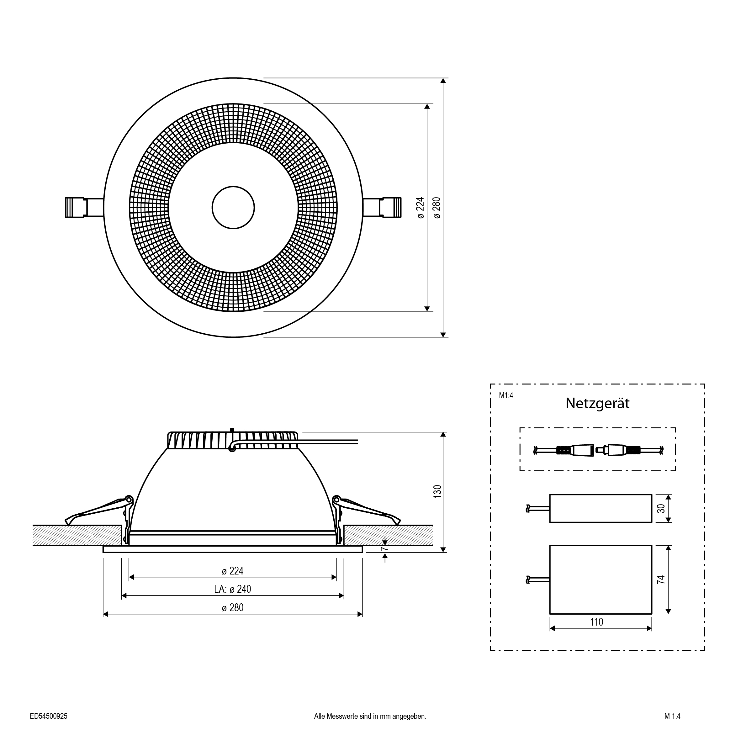 Mit der LED Deckeneinbauleuchte lassen sich, dank der hohen Lichtausbeute, auch anspruchsvolle Beleuchtungsaufgaben problemlos realisieren. Die Leuchte kann auch über eine Zentralbatterie betrieben werden, mit einer Eingangsspannung von 176-250V/DC. Sie erfüllt die DIN EN60598-2-22:2014 und bestätigt die Zulassung im Bereich der Notbeleuchtung. Mit dem rückseitig angebrachten Schalter kann eine von drei möglichen Farbtemperaturen eingestellt werden. Die möglichen Farbtemperaturen und daraus resultierenden Lumen sind: 3000K (5950lm), 4000K (6350lm) und 5700K (6150lm). Da die Leuchte inkl. externen Netzgerät geliefert wird, fallen hierfür keine zusätzlichen Kosten an. Protokoll: DT6, DALI2, Push-dim.