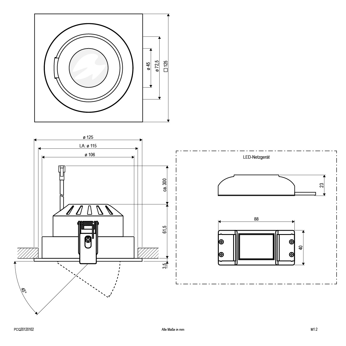 Dreh- und schwenkbare Deckeneinbauleuchte für vielfältige Anwendungen im Innenbereich. Sowohl Effektbeleuchtungen, Akzentuierte Beleuchtung und vieles mehr, lassen sich mit dieser Leuchte umsetzten. Dank des fest verbauten LED-Chips entfallen zusätzliche Kosten für Leuchtmittel. Im Lieferumfang ist ein Netzgerät enthalten mit einer Anschlussspannung von 100 bis 230V. Die Maße des Netzgeräts sind: LxBxH: 111mm x 42mm x 26mm. Die Leuchte lässt sich in eine Richtung schwenken, mit einem Schwenkwinkel von 45°, und um 160° drehen.