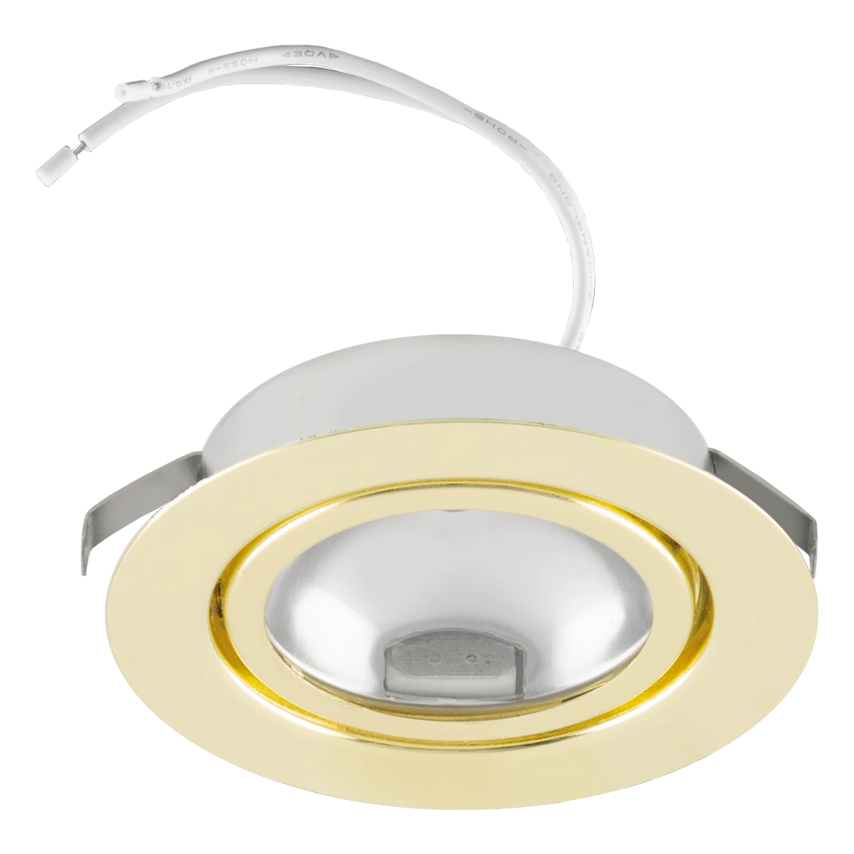 Die Leuchte ist auf Grund der MM-Kennzeichnung für den Möbeleinbau geeignet, kann aber ebenso auch als Deckenleuchte verwendet werden. Das Gehäuse ist aus Kunststoff gefertigt, der sichtbare Leuchtenring ist aus Stahl gefertigt und gold lackiert. An der Leuchte befindet sich eine 15cm lange Anschlussleitung, die optional mit dem beiliegenden AMP-Stecker versehen werden kann. Um einen möglichst einfachen Wechsel des Leuchtmittels zu gewährleisten, lässt sich die Glasabdeckung einfach aufklappen.