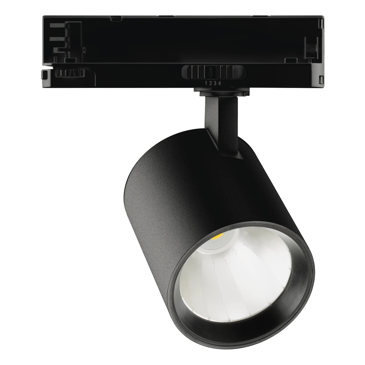 LED Schienenstrahler für vielfältige Anwendungen im Innenbereich. Sowohl Effektbeleuchtungen, Raumbeleuchtung, akzentuierte Beleuchtung und vieles mehr, lassen sich mit dieser Leuchte umsetzten. Die Leuchte kann auch über eine Zentralbatterie betrieben werden, mit einer Eingangsspannung von 179-240V/DC. Mittels Schalter kann eine von vier möglichen Leistungen (11W, 15W, 20W, 25W) eingestellt werden. Die möglichen Lumen unter Berücksichtigung der einstellbaren Wattage sind: 11W (1485lm), 15W (2025lm), 20W (2700lm), 25W (3375lm). Die Leuchte lässt sich um 355° drehen und auf eine Seite schwenken, mit einem Schwenkwinkel von 90°. Die Leuchte ist inklusive Adapter für 3-Phasen-Schienen. Kompatible 3-Phasenschienen: Global, Eutrac, Nuco, Ivela, Staff, Norlux, Powergear, Stucchi, Erco. Die Gehäusefarbe entspricht RAL9005.