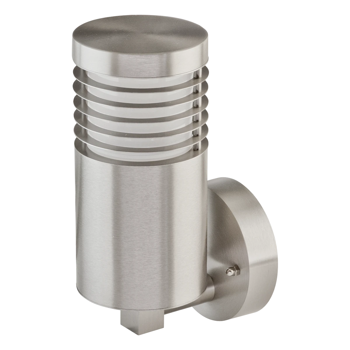 Massive Wandleuchte, edel und hochwertig, gefertigt aus Edelstahl. Es dürfen Energiesparleuchtmittel bis max. 15W verwendet werden, wobei der Durchmesser 45mm und die Höhe inkl. Sockel 120mm nicht überschreiten dürfen. Sockelmaß: ØxT: 111mm x 28mm. Passend zur Wandleuchte, gibt es auch die Pollerleuchten (ELR210 und ELR623).