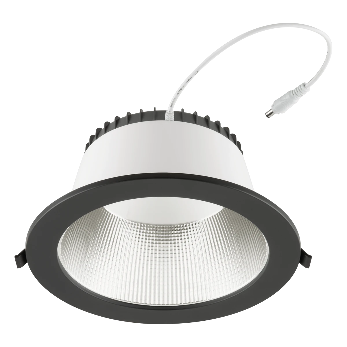 Mit der LED Deckeneinbauleuchte lassen sich, dank der hohen Lichtausbeute, auch anspruchsvolle Beleuchtungsaufgaben problemlos realisieren. Die Leuchte kann auch über eine Zentralbatterie betrieben werden, mit einer Eingangsspannung von 176-250V/DC. Sie erfüllt die DIN EN60598-2-22:2014 und bestätigt die Zulassung im Bereich der Notbeleuchtung. Mit dem rückseitig angebrachten Schalter kann eine von drei möglichen Farbtemperaturen eingestellt werden. Die möglichen Farbtemperaturen und daraus resultierenden Lumen sind: 3000K (4165lm), 4000K (4445lm) und 5700K (4305lm). Da die Leuchte inkl. externen Netzgerät geliefert wird, fallen hierfür keine zusätzlichen Kosten an. Protokoll: DT6, DALI2, Push-dim.
