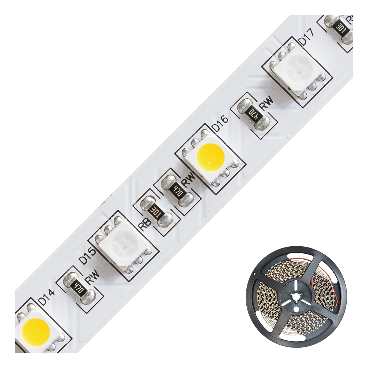 Kürzbarer und flexibler RGBW-LED-Strip mit hochleistungs LED-Chips. Gegenüber einfachen RGB-Strips, sind hier zusätzlich zu den RGB-Chips auch LED-Chips in Warmweiß auf dem Strip verbaut. Die auf diesem Strip verbauten superbright LED-Chips erreichen im Vergleich zu herkömmlichen LED-Chips eine deutlich höhere Lichtausbeute bei gleicher Leistungsaufnahme, bzw. vergleichbare Lichtausbeute bei geringerer Leistungsaufnahme. Die RGB- und WW-LED-chips lassen sich wahlweise zusammen oder separat zu- und abschalten. Dadurch sind die Strips perfekt geeignet, um anspruchsvolle Beleuchtungsszenarien umzusetzen. Ganz egal, ob Ambientebeleuchtung, Hauptbeleuchtung, oder eine Kombination aus beidem, z. B. in Wohnzimmer, Schlafzimmer Flur, oder vieles mehr. Der Phantasie sind nahezu keine Grenzen gesetzt. Wichtig: Um ein überhitzen des Strips zu vermeiden, darf dieser nur auf Wärmeleitenden Untergründen verbaut werden, vorzugsweise in Aluminiumprofilen. Die für den Strip benötigten Steuerungen sind separat erhältlich. Die weiß-Farbtemperatur beträgt 3000K. Die maximale Lichtausbeute beträgt 236lm im RGB-Modus und 571lm im Weiß-Modus.