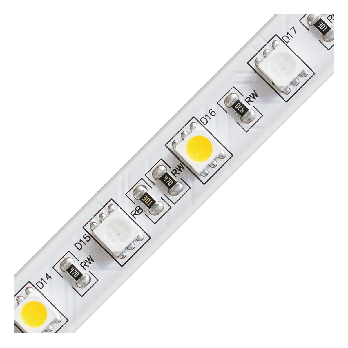 Der LED-Strip kann in jeder Wunschlänge (Angabe in Meter), bis maximal 10m, unter Beachtung des Teilungsmaßes von 166mm konfektioniert werden. Die maximale Einspeiselänge bei einseitiger Einspeisung beträgt 5m. Der konfektionierte Strip wird standardmäßig einseitig mit einer 0,5m langen Anschlussleitung (Kabelquerschnitt: 0,3mm²) ausgeliefert. Wichtig: Um ein Überhitzen des Strips zu vermeiden, darf dieser nur auf wärmeleitenden Untergründen verbaut werden, vorzugsweise auf bzw. in Aluminiumprofilen. Die weiß-Farbtemperatur beträgt 3000K. Die maximale Lichtausbeute beträgt 213lm im RGB-Modus und 495lm im Weiß-Modus.