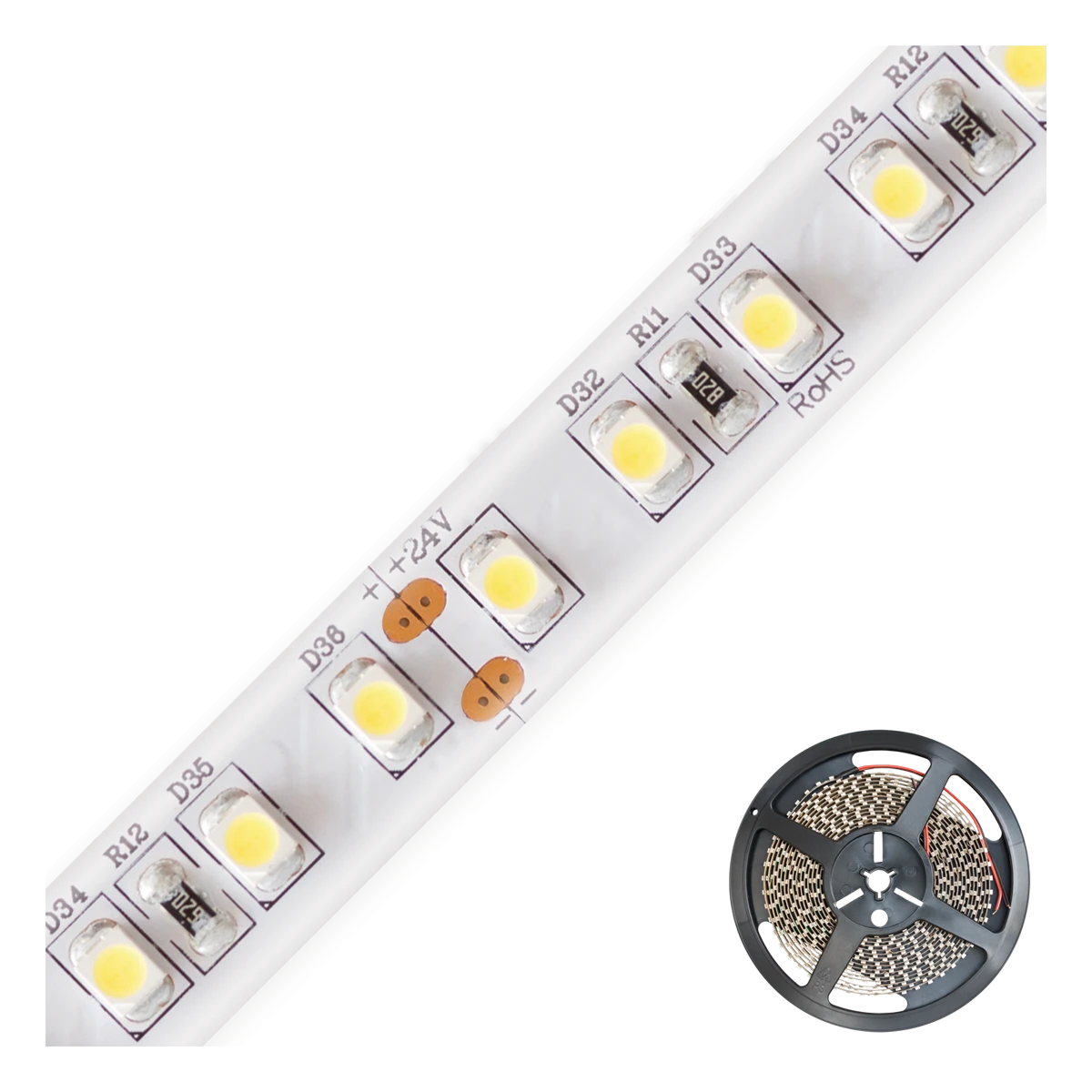 Kürzbarer und flexibler LED-Strip mit hochleistungs LED-Chips. Die auf diesem Strip verbauten superbright LED-Chips erreichen im Vergleich zu herkömmlichen LED-Chips eine deutlich höhere Lichtausbeute bei gleicher Leistungsaufnahme, bzw. vergleichbare Lichtausbeute bei geringerer Leistungsaufnahme. Dadurch lassen sich die verschiedensten Anwendungen, wie z. B. direkte oder indirekte Beleuchtung für Wohnzimmer, Schlafzimmer, Flur, etc. noch Energiesparender umsetzen. Auch Projekte mit gehobenen Ansprüchen bezüglich der Lichtausbeute lassen sich mit diesen Strips realisieren. Wichtig: Um ein überhitzen des Strips zu vermeiden, darf dieser nur auf Wärmeleitenden Untergründen verbaut werden, vorzugsweise in Aluminiumprofilen. Die Lichtausbeute beträgt 860lm pro Meter.