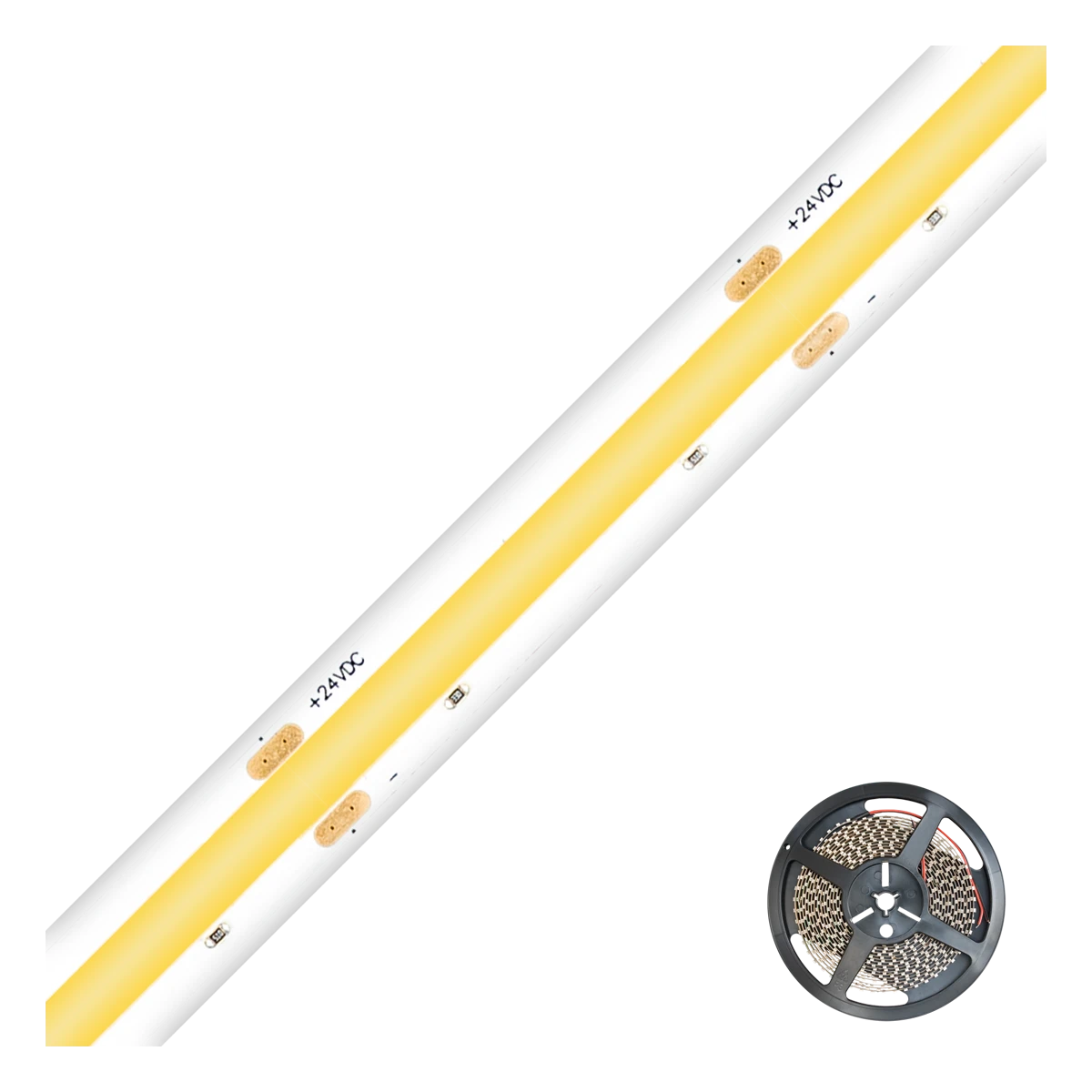 Kürzbarer und flexibler LED-Strip mit COB LED-Chips. Durch die verwendeten COB LED-Chips sind zwischen den einzelnen LED-Chips keine Abstände, wodurch wiederum ein unterbrechungsfreies Lichtbild erzielt wird. Auch Projekte mit gehobenen Ansprüchen bezüglich der Lichtausbeute lassen sich mit diesen Strips realisieren. Wichtig: Um ein überhitzen des Strips zu vermeiden, darf dieser nur auf Wärmeleitenden Untergründen verbaut werden, vorzugsweise in Aluminiumprofilen. Exaktes Binning erlaubt Farbtoleranzen von maximal +/-50K.