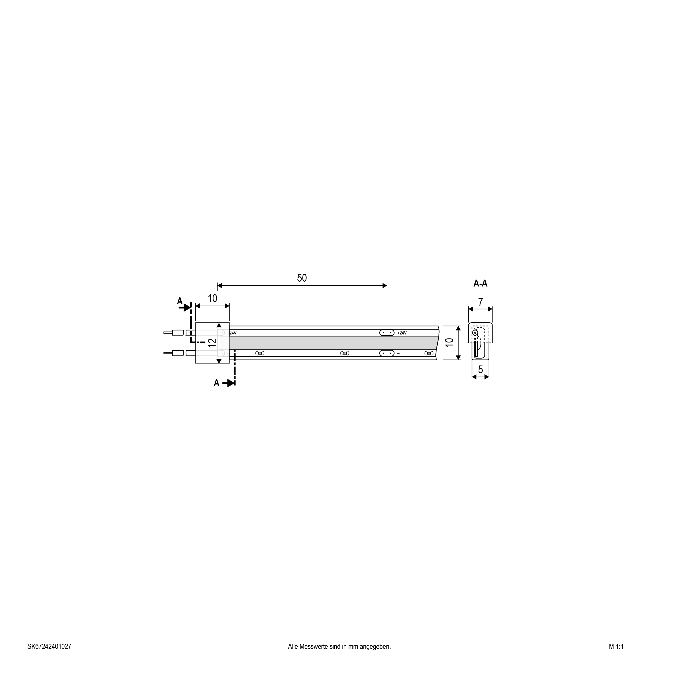 Der LED-Strip kann in jeder Wunschlänge (Angabe in Meter), bis maximal 5m, unter Beachtung des Teilungsmaßes von 50mm konfektioniert werden. Die maximale Einspeiselänge bei einseitiger Einspeisung beträgt 5m. Der konfektionierte Strip wird standardmäßig einseitig mit einer 0,5m langen Anschlussleitung (Kabelquerschnitt: 0,5mm²) ausgeliefert. Wichtig: Um ein Überhitzen des Strips zu vermeiden, darf dieser nur auf wärmeleitenden Untergründen verbaut werden, vorzugsweise auf bzw. in Aluminiumprofilen.