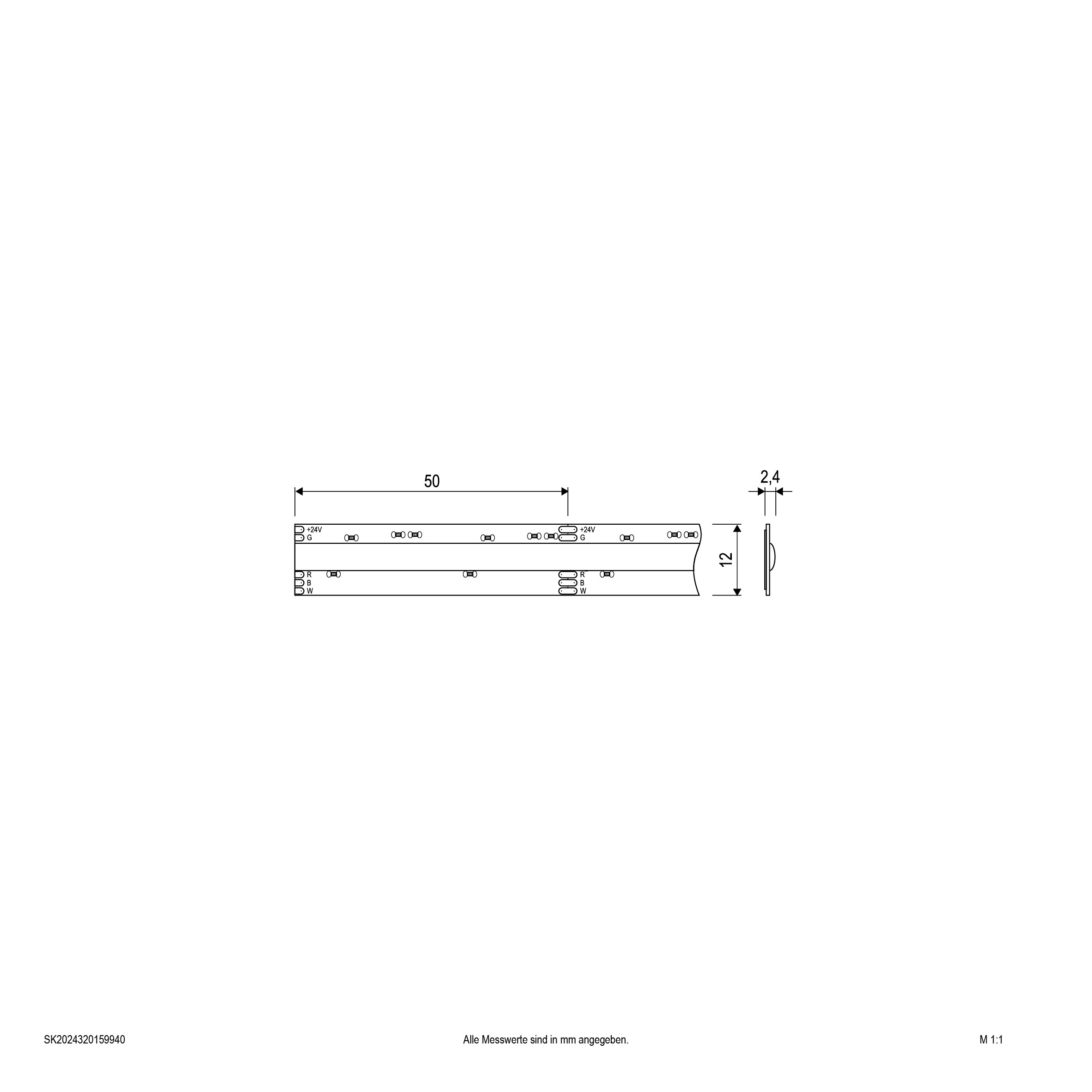 Der LED-Strip kann in jeder Wunschlänge (Angabe in Meter), bis maximal 5m, unter Beachtung des Teilungsmaßes von 50mm konfektioniert werden. Die maximale Einspeiselänge bei einseitiger Einspeisung beträgt 5m. Der konfektionierte Strip wird standardmäßig einseitig mit einer 0,5m langen Anschlussleitung (Kabelquerschnitt: 0,5mm²) ausgeliefert. Wichtig: Um ein Überhitzen des Strips zu vermeiden, darf dieser nur auf wärmeleitenden Untergründen verbaut werden, vorzugsweise auf bzw. in Aluminiumprofilen. Die weiß-Farbtemperatur beträgt 4000K. Die maximale Lichtausbeute beträgt 491lm im RGB-Modus und 487lm im Weiß-Modus.