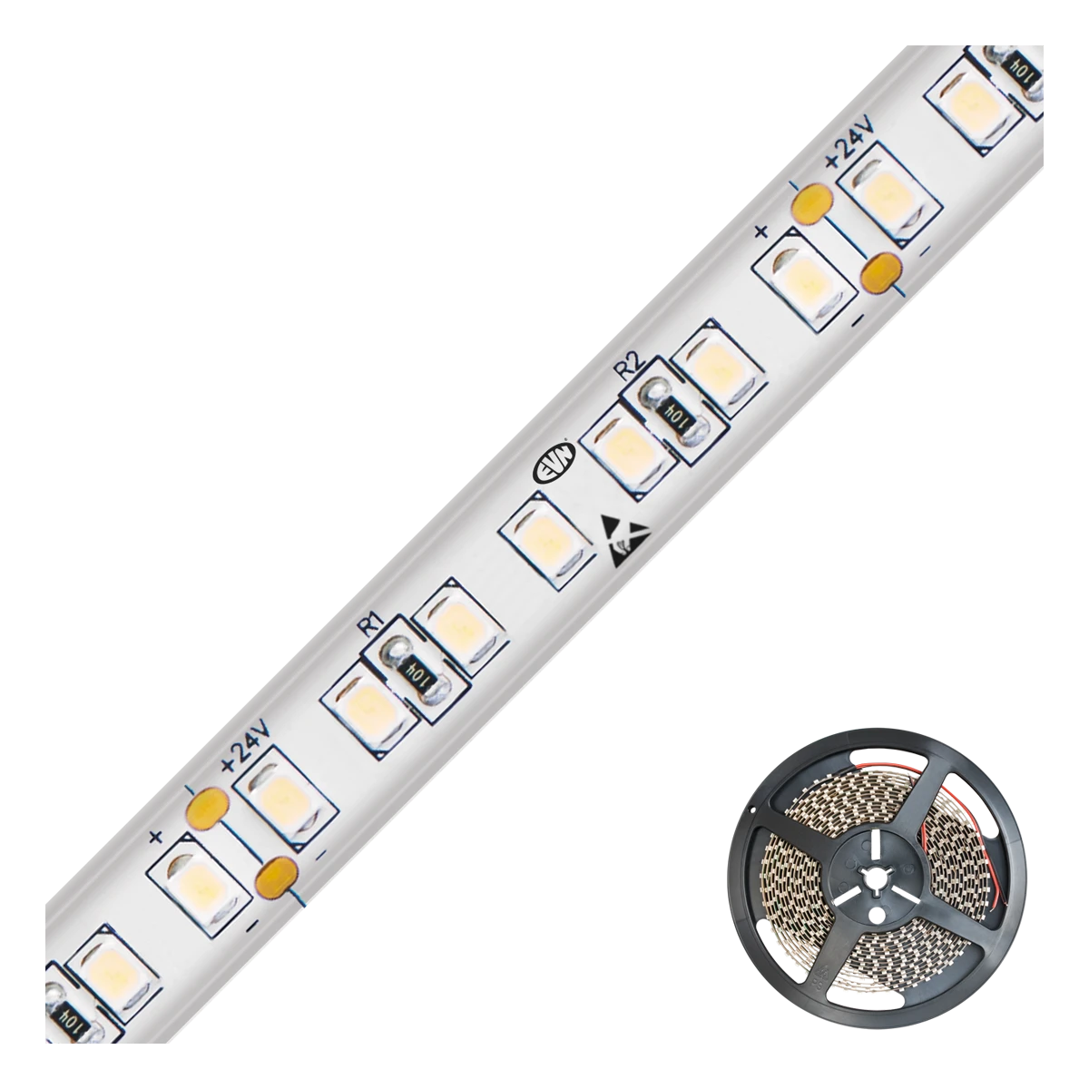 Kürzbarer und flexibler LED-Strip mit hochleistungs-LED-Chips und Strom-Konstanter. Die auf diesem Strip zusätzlich verbauten IC’s (Strom-Konstanter) senken den Energieverbrauch im Vergleich zu den anderen super-bright-LED-Strips. Da der Strip mit 48V/DC betrieben wird können Längen bis zu max. 15m bei einseitiger Einspeisung betrieben werden. Dadurch lassen sich die verschiedensten Anwendungen, wie z. B. direkte oder indirekte Beleuchtung für Wohnzimmer, Schlafzimmer, Flur, etc. noch energiesparender umsetzen. Wichtig: Um ein überhitzen des Strips zu vermeiden, darf dieser nur auf wärmeleitenden Untergründen verbaut werden, vorzugsweise auf bzw. in Aluminiumprofilen. Der Strip ist außerdem UV-beständig. ta: -20°C - 45°C.