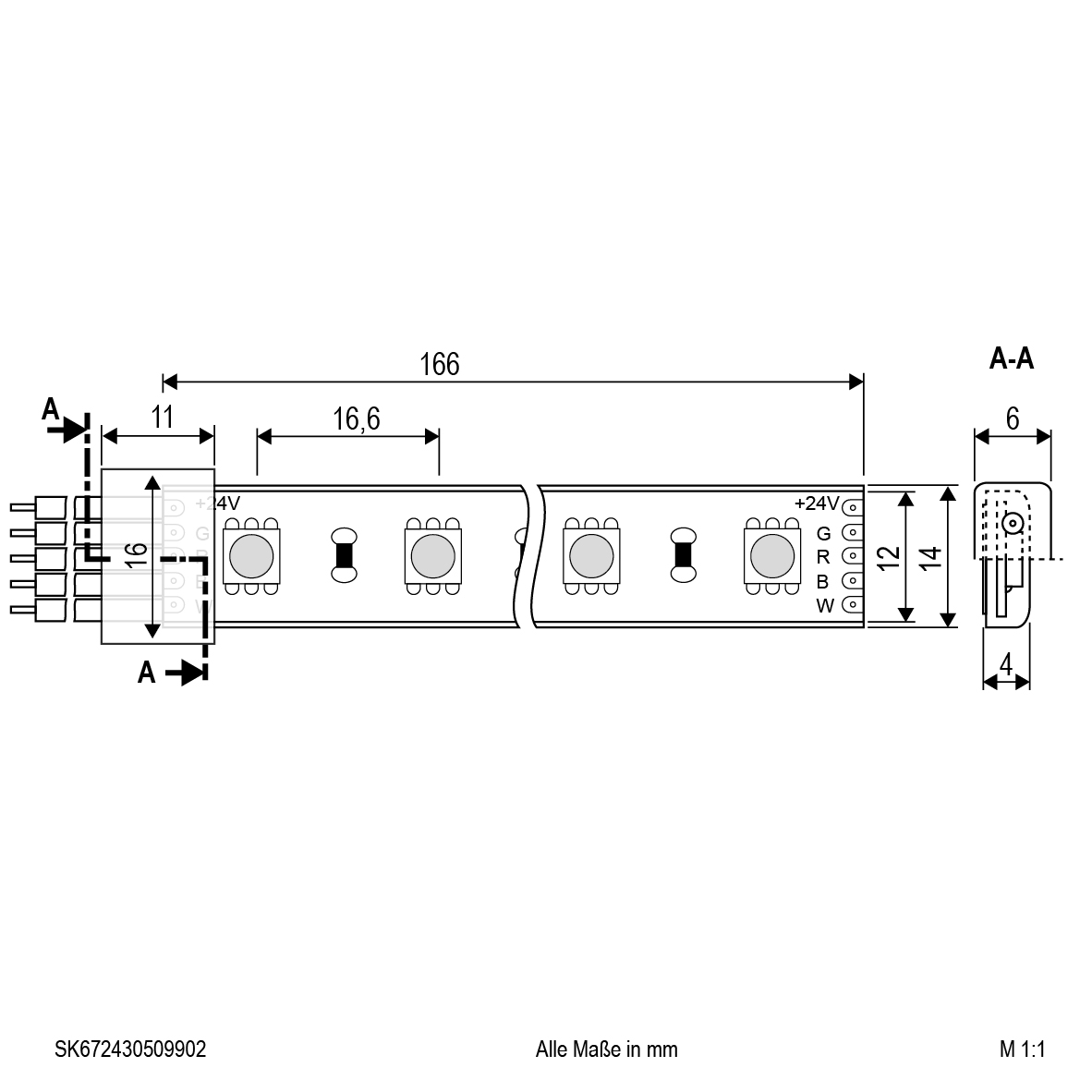 Der LED-Strip kann in jeder Wunschlänge (Angabe in Meter), bis maximal 10m, unter Beachtung des Teilungsmaßes von 166mm konfektioniert werden. Die maximale Einspeiselänge bei einseitiger Einspeisung beträgt 5m. Der konfektionierte Strip wird standardmäßig einseitig mit einer 0,5m langen Anschlussleitung (Kabelquerschnitt: 0,3mm²) ausgeliefert. Wichtig: Um ein Überhitzen des Strips zu vermeiden, darf dieser nur auf wärmeleitenden Untergründen verbaut werden, vorzugsweise auf bzw. in Aluminiumprofilen. Die weiß-Farbtemperatur beträgt 3000K. Die maximale Lichtausbeute beträgt 203lm im RGB-Modus und 476lm im Weiß-Modus.