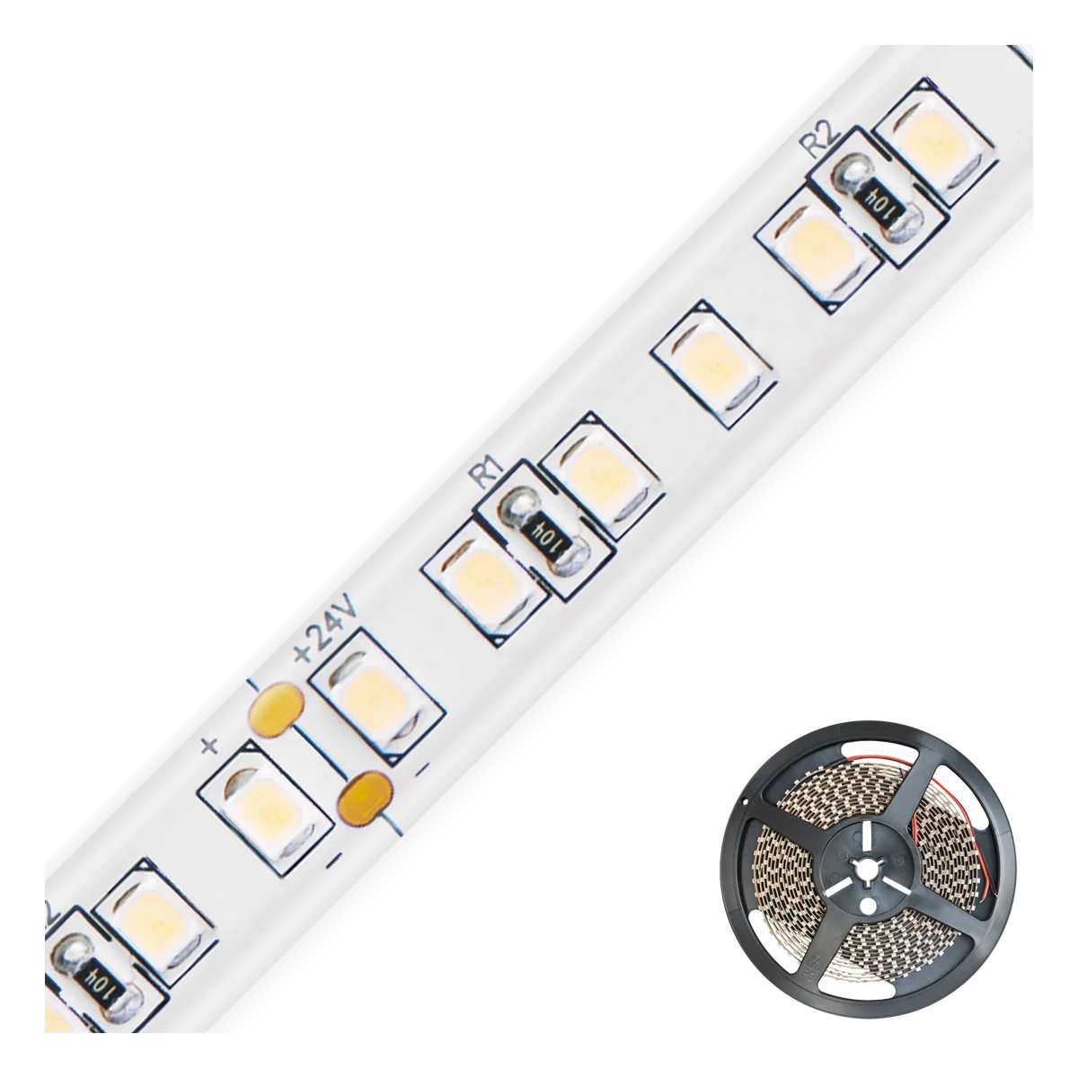 Kürzbarer und flexibler LED-Strip mit hochleistungs LED-Chips. Die auf diesem Strip verbauten superbright LED-Chips erreichen im Vergleich zu herkömmlichen LED-Chips eine deutlich höhere Lichtausbeute bei gleicher Leistungsaufnahme, bzw. vergleichbare Lichtausbeute bei geringerer Leistungsaufnahme. Dadurch lassen sich die verschiedensten Anwendungen, wie z. B. direkte oder indirekte Beleuchtung für Wohnzimmer, Schlafzimmer, Flur, etc. noch Energiesparender umsetzen. Auch Projekte mit gehobenen Ansprüchen bezüglich der Lichtausbeute lassen sich mit diesen Strips realisieren. Wichtig: Um ein überhitzen des Strips zu vermeiden, darf dieser nur auf Wärmeleitenden Untergründen verbaut werden, vorzugsweise in Aluminiumprofilen. Die Lichtausbeute beträgt 1435lm pro Meter.