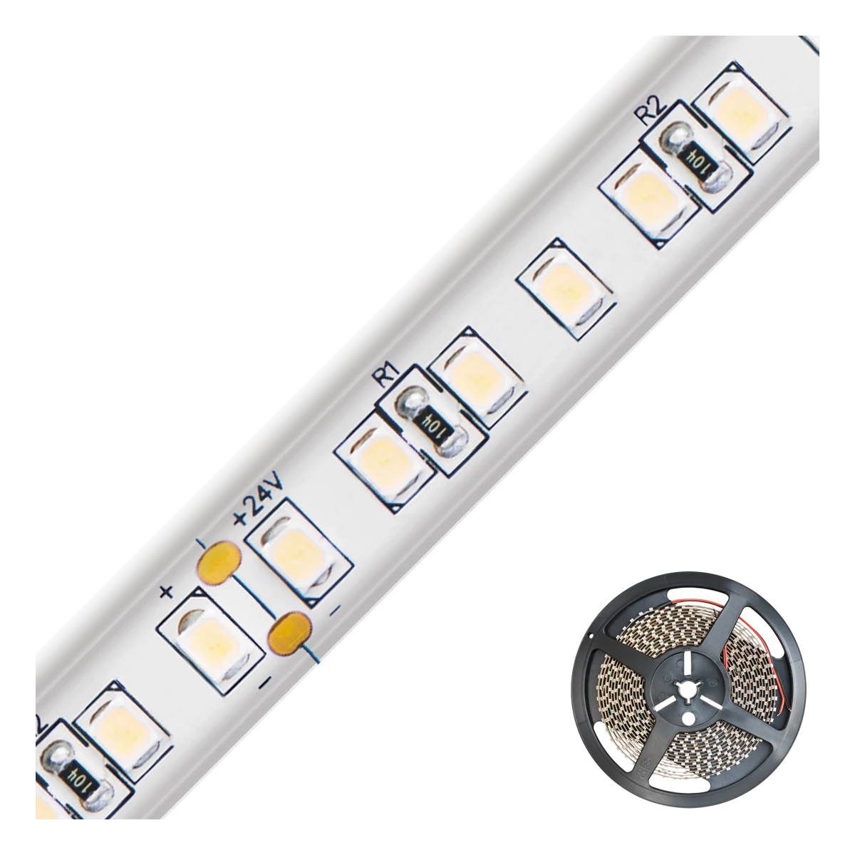 Kürzbarer und flexibler LED-Strip mit hochleistungs LED-Chips. Die auf diesem Strip verbauten superbright LED-Chips erreichen im Vergleich zu herkömmlichen LED-Chips eine deutlich höhere Lichtausbeute bei gleicher Leistungsaufnahme, bzw. vergleichbare Lichtausbeute bei geringerer Leistungsaufnahme. Dadurch lassen sich die verschiedensten Anwendungen, wie z. B. direkte oder indirekte Beleuchtung für Wohnzimmer, Schlafzimmer, Flur, etc. noch Energiesparender umsetzen. Auch Projekte mit gehobenen Ansprüchen bezüglich der Lichtausbeute lassen sich mit diesen Strips realisieren. Wichtig: Um ein überhitzen des Strips zu vermeiden, darf dieser nur auf Wärmeleitenden Untergründen verbaut werden, vorzugsweise in Aluminiumprofilen. Die Lichtausbeute beträgt 1435lm pro Meter.