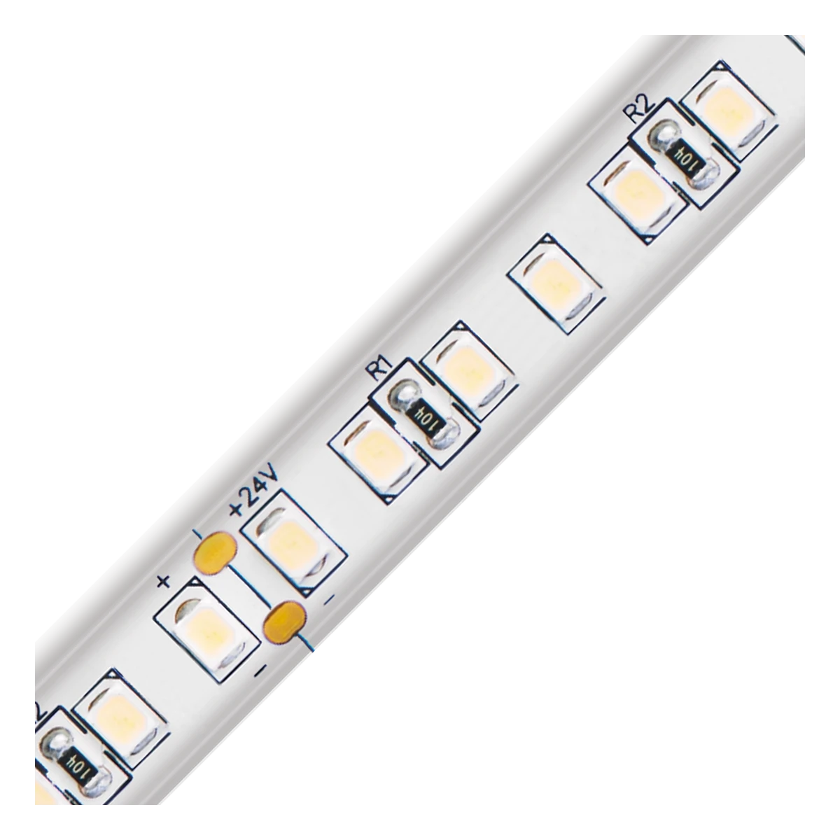 Der LED-Strip kann in jeder Wunschlänge (Angabe in Meter), bis maximal 10m, unter Beachtung des Teilungsmaßes von 50mm konfektioniert werden. Die maximale Einspeiselänge bei einseitiger Einspeisung beträgt 5m. Der konfektionierte Strip wird standardmäßig einseitig mit einer 0,5m langen Anschlussleitung (Kabelquerschnitt: 0,3mm²) ausgeliefert. Wichtig: Um ein Überhitzen des Strips zu vermeiden, darf dieser nur auf wärmeleitenden Untergründen verbaut werden, vorzugsweise auf bzw. in Aluminiumprofilen. Die Lichtausbeute beträgt 1435lm pro Meter.