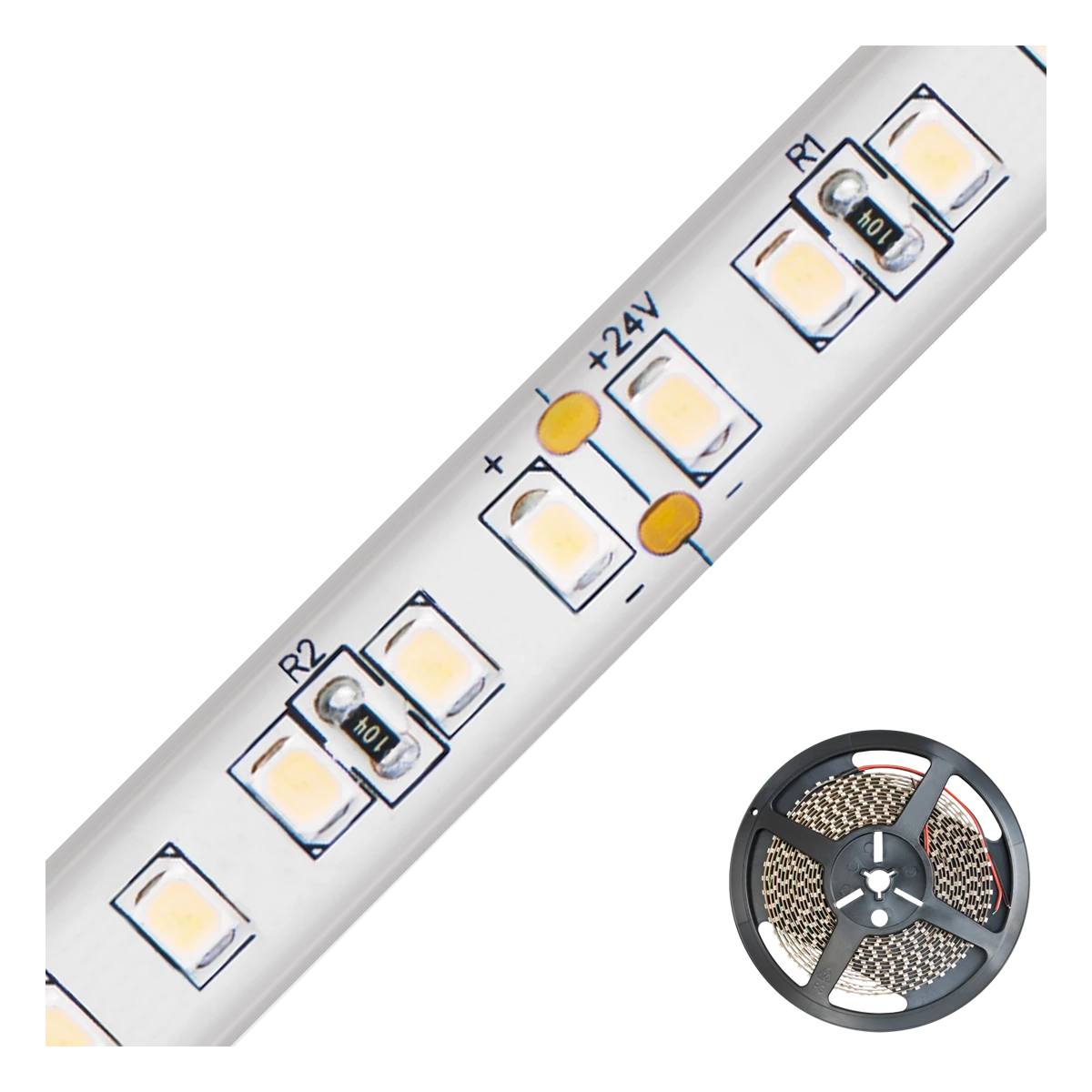 Kürzbarer und flexibler LED-Strip mit hochleistungs LED-Chips. Die auf diesem Strip verbauten superbright LED-Chips erreichen im Vergleich zu herkömmlichen LED-Chips eine deutlich höhere Lichtausbeute bei gleicher Leistungsaufnahme, bzw. vergleichbare Lichtausbeute bei geringerer Leistungsaufnahme. Dadurch lassen sich die verschiedensten Anwendungen, wie z. B. direkte oder indirekte Beleuchtung für Wohnzimmer, Schlafzimmer, Flur, etc. noch Energiesparender umsetzen. Auch Projekte mit gehobenen Ansprüchen bezüglich der Lichtausbeute lassen sich mit diesen Strips realisieren. Wichtig: Um ein überhitzen des Strips zu vermeiden, darf dieser nur auf Wärmeleitenden Untergründen verbaut werden, vorzugsweise in Aluminiumprofilen. Die Lichtausbeute beträgt 1859lm pro Meter.