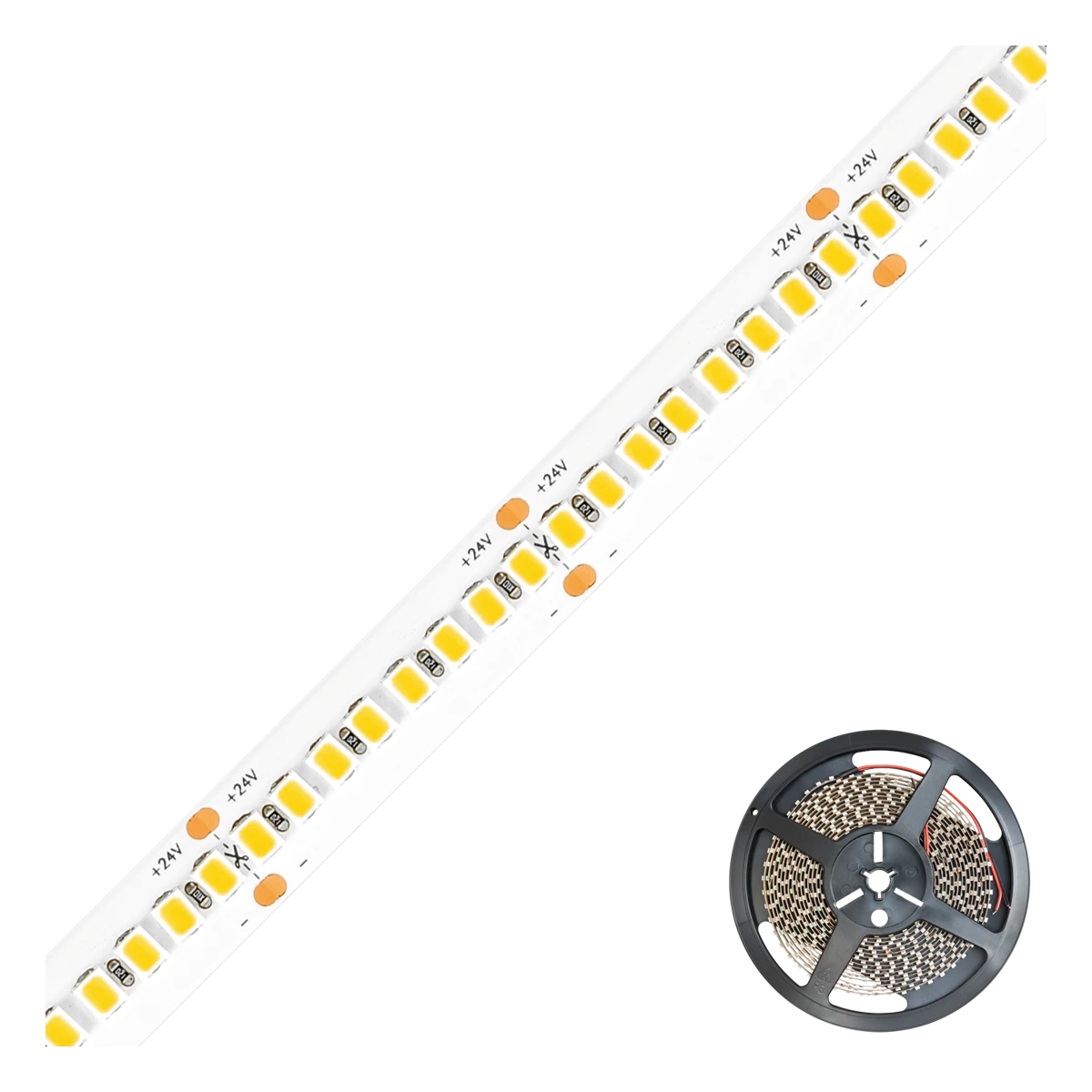 Kürzbarer und flexibler LED-Strip mit hochleistungs LED-Chips. Die auf diesem Strip verbauten superbright LED-Chips erreichen im Vergleich zu herkömmlichen LED-Chips eine deutlich höhere Lichtausbeute bei gleicher Leistungsaufnahme, bzw. vergleichbare Lichtausbeute bei geringerer Leistungsaufnahme. Dadurch lassen sich die verschiedensten Anwendungen, wie z. B. direkte oder indirekte Beleuchtung für Wohnzimmer, Schlafzimmer, Flur, etc. noch Energiesparender umsetzen. Auch Projekte mit gehobenen Ansprüchen bezüglich der Lichtausbeute lassen sich mit diesen Strips realisieren. Wichtig: Um ein überhitzen des Strips zu vermeiden, darf dieser nur auf Wärmeleitenden Untergründen verbaut werden, vorzugsweise in Aluminiumprofilen. Exaktes Binning erlaubt Farbtoleranzen von maximal +/-50K. Die Lichtausbeute beträgt 3940lm pro Meter.