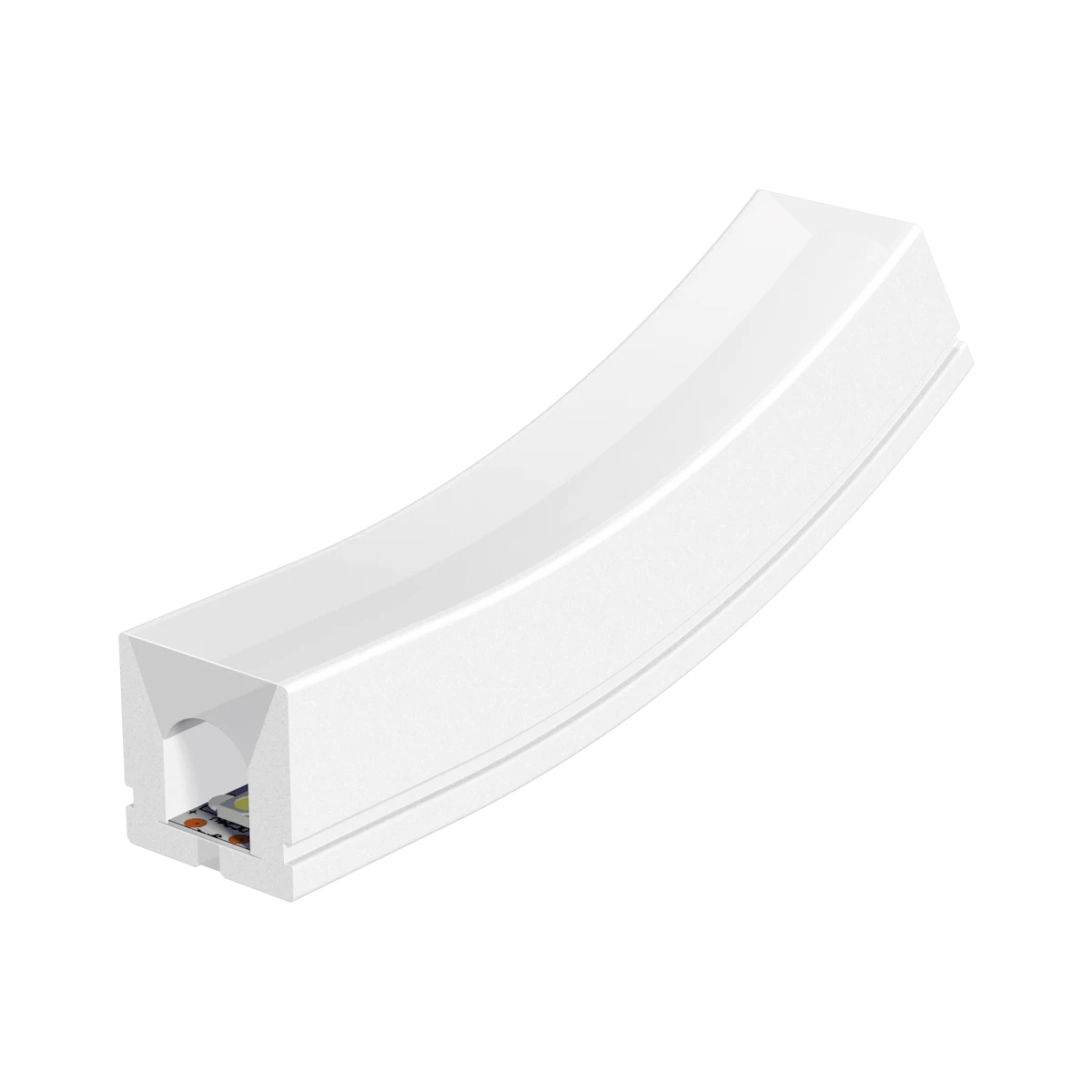 Der Neon-Flex LED-Strip kann in jeder Wunschlänge (Angabe der benötigten Segmente), unter Beachtung des Teilungsmaßes von 62,5mm konfektioniert werden. Die maximale Einspeiselänge beträgt 5m bei einseitiger Einspeisung, bzw. 10m bei beidseitiger Einspeisung. Der konfektionierte Strip wird standardmäßig einseitig mit einer 0,5m langen Anschlussleitung (5x 0,50mm²) mit freien Aderenden ausgeliefert. Da es sich hier um einen Top-View Neon-Flex-Strip handelt, ist der LED-Strip unten angebracht, wodurch sich der Neon-Flex-Strip nach oben und unten beliebig biegen lässt (Biegeradius beachten). Außerdem ist der Strip UV-, Chlor, Salzwasser-, und Lösemittel- beständig (nicht Meerwasserbeständig). Der Einsatz eines Aluminiumprofils ist optional möglich, jedoch nicht unbedingt erforderlich. Die Lichtausbeute beträgt RGB: 190lm pro Meter, Weiß (3000K): 140lm pro Meter. Mittlere Nennlebensdauer: L70B10 bei 50000h.
