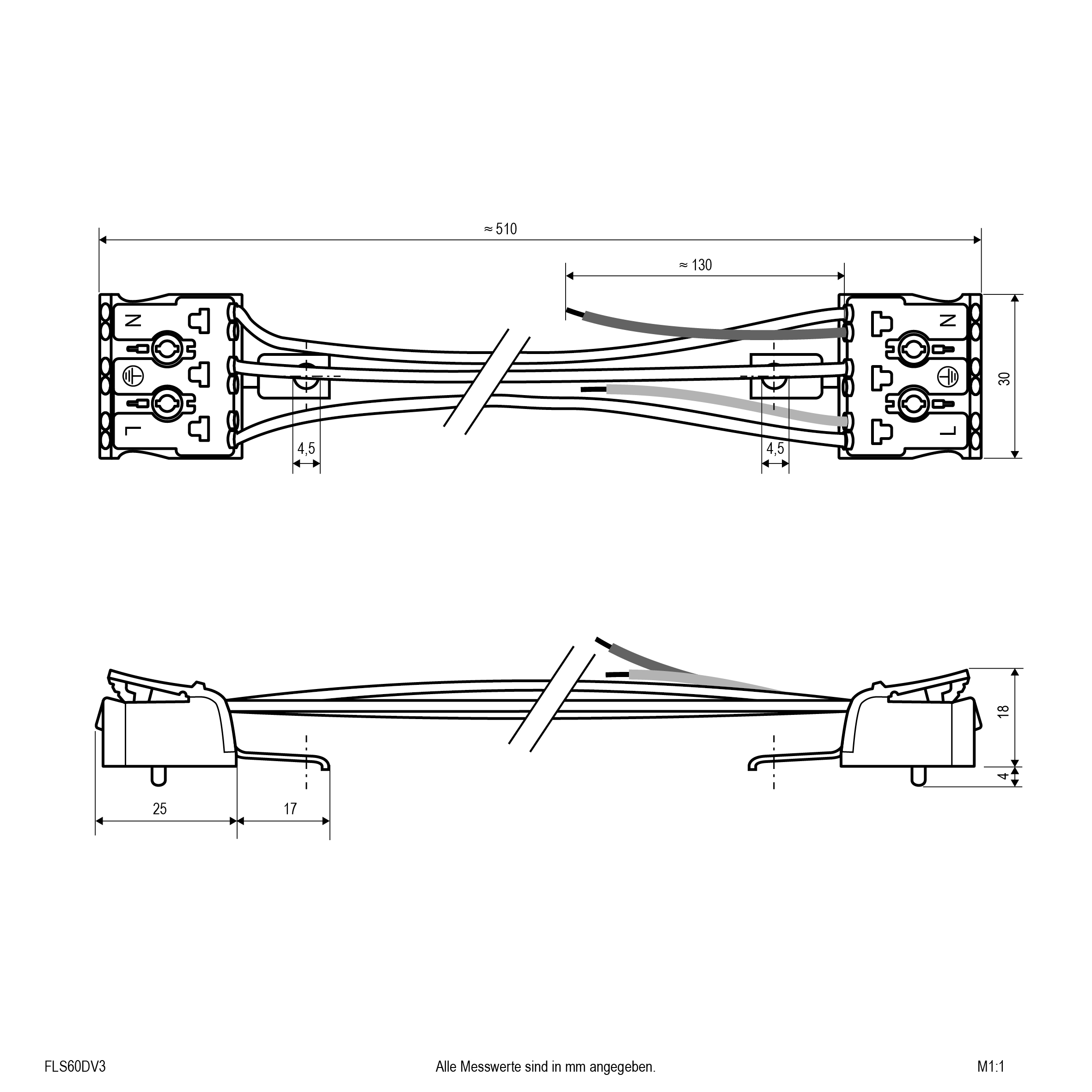 Durchgangsverdrahtungsset für die Leuchten FLS600125 und FLD600125. 3x1,5mm² Kabel mit 2x 3-fach Steckklemme.