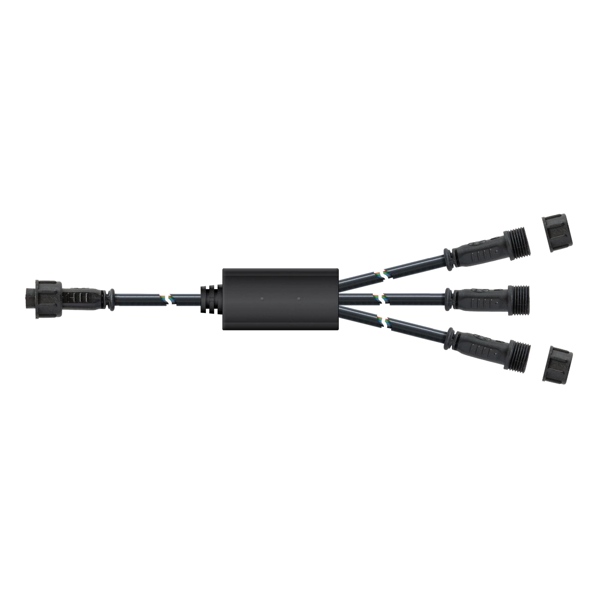 Der 3-fach Verteiler, für RGB-Leuchten, verfügt über 1x Stecker und 3x Buchse und kann sowohl für 12V, als auch 24V Anwendungen verwendet werden. Die Steckverbindung wird zusätzlich durch eine Überwurfmutter gesichert, so dass sich diese nicht ungewollt lösen kann und vor Feuchtigkeit geschützt ist. Dadurch wird die Schutzart IP65 erreicht, was wiederum dafür sorgt, dass das Stecksystem im Außenbereich eingesetzt werden kann. Im Lieferumfang sind 3 Endkappen enthalten, um nicht benötigte Buchsen verschließen und somit vor Feuchtigkeit schützen zu können.