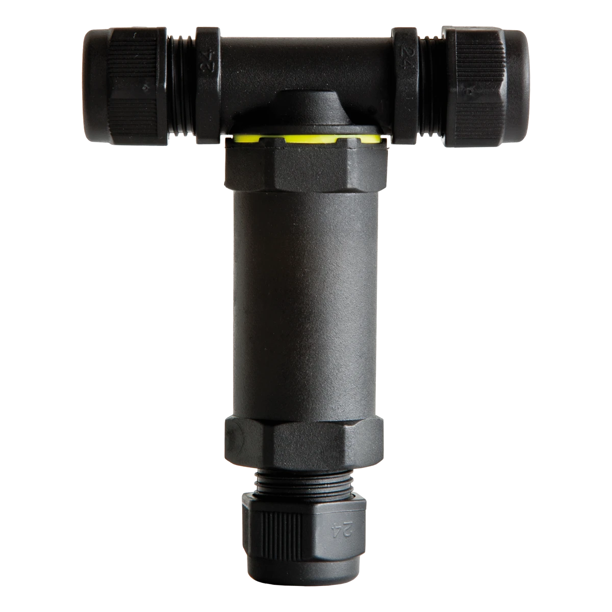 Die Schraubmuffe (T-Abzweigung) kann für vielfältige Kabelverbindungen im Außenbereich verwendet werden. Die zu verbindenden Kabel werden allseitig durch die Schraubverbindung in Verbindung mit den Dichtungseinsätzen sicher an ihrem Platz gehalten. Im Inneren befindet sich die Schraubklemme zur Verdrahtung der Kabel. Technische Daten: max. 400V, 20A, Schutzart: IP68.