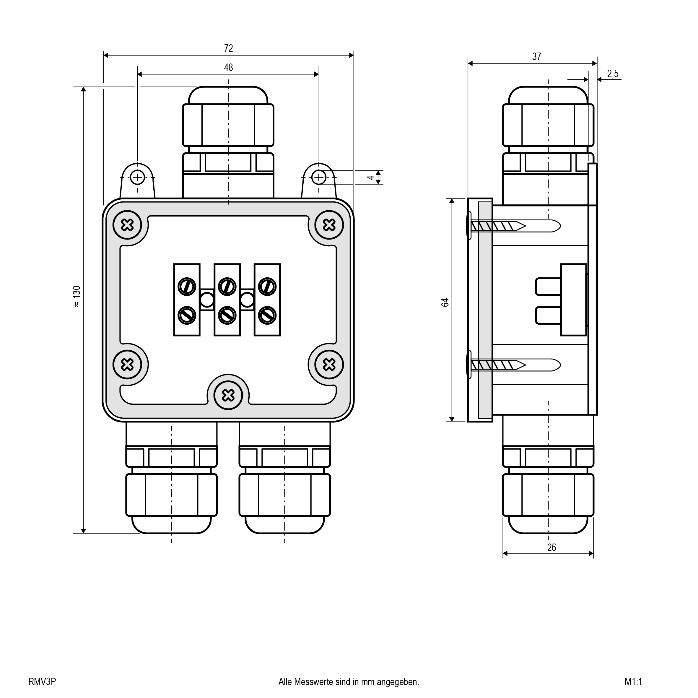 Die Verteiler-Box kann für vielfältige Kabelverbindungen im Außenbereich verwendet werden. Die zu verbindenden Kabel werden allseitig durch die Schraubverbindung in Verbindung mit den Dichtungseinsätzen sicher an ihrem Platz gehalten. Im Inneren der Box befindet sich die Schraubklemme zur Verdrahtung der Kabel. Die Box kann optional auch mit Gießharz vergossen werden. Technische Daten: max. 250V, Schutzart: IP67, LxBxH: 130x72x36m.