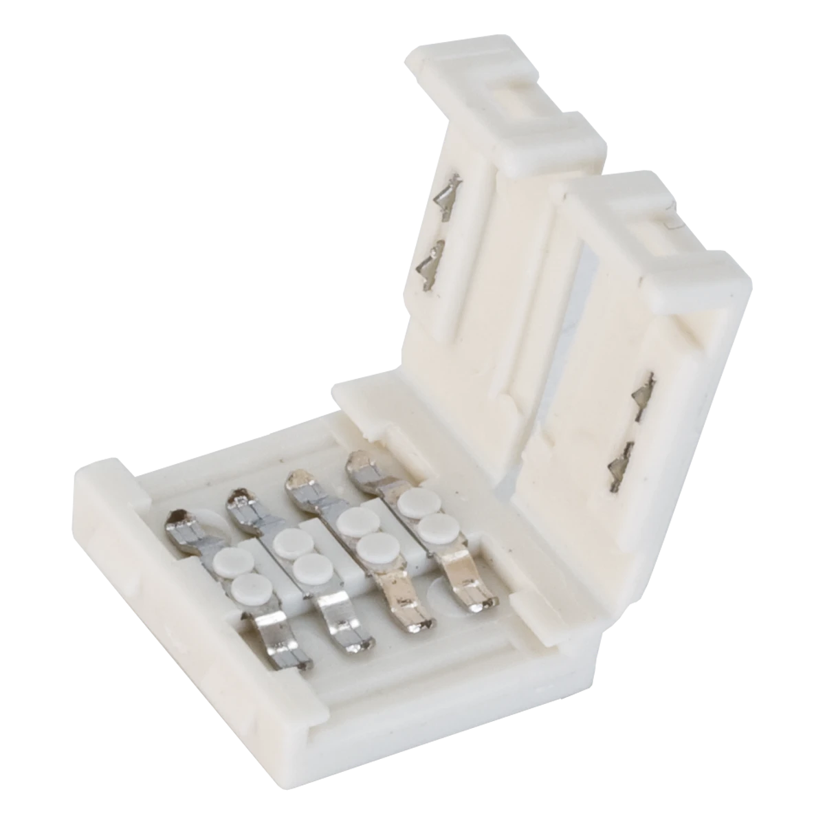 Der Direktverbinder wird einfach an den Lötpunkten des jeweiligen LED-Strips aufgeschoben, wodurch zwei Strips einfach verbunden werden können. Geeignet für RGB-Strips mit einer Breite von 10mm. Damit die Befestigung des Clips problemlos möglich ist, muss der erste Chip auf dem Strip mindestens 8mm von der Schnittkante entfernt sitzen, dies ist im Regelfall bei Strips mit max. 60 Chips pro Meter gegeben. Die maximale Belastbarkeit beträgt 36V und 5A. Maße: LxBxH: 15,5 x 14,5 x 5mm.